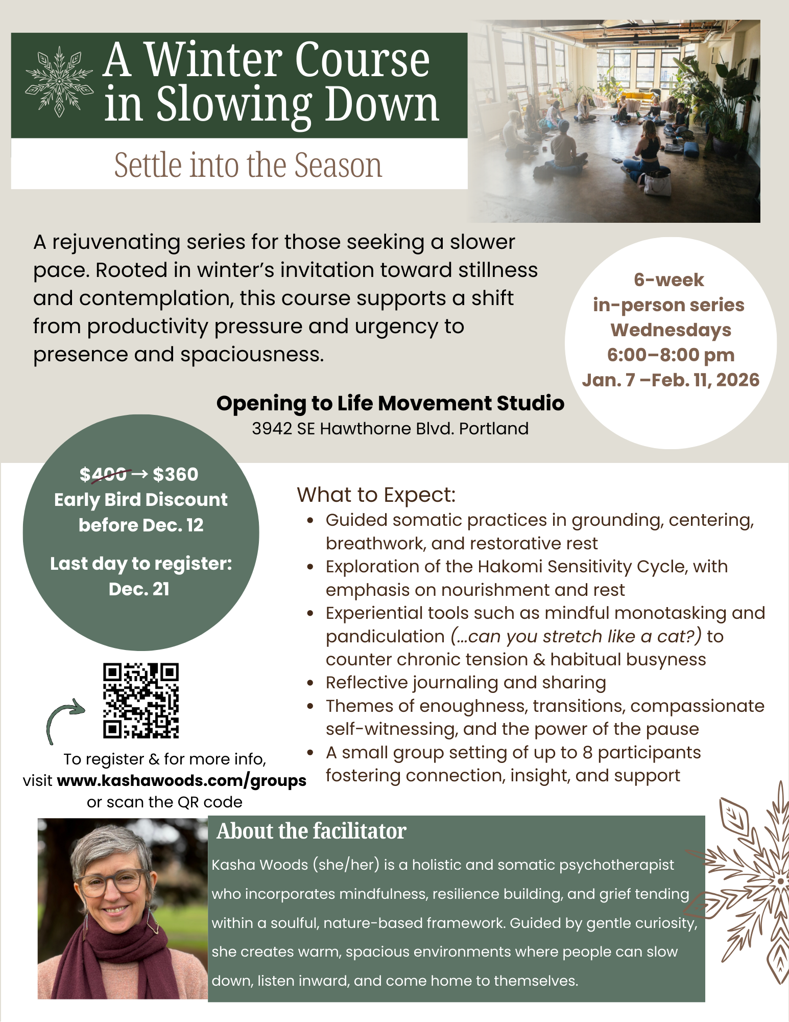 Over six experiential evenings, this course offers a warm, structured space to slow down, step out of habitual urgency, and reconnect with your natural pace. Through somatic practices, mindfulness, reflective inquiry, and community learning, we’ll explore rest, spaciousness, and the shift from doing to being. Kasha draws on her background as a psychotherapist and social-emotional learning educator to guide practices that support grounding, presence, and alignment with winter’s quieter rhythm.